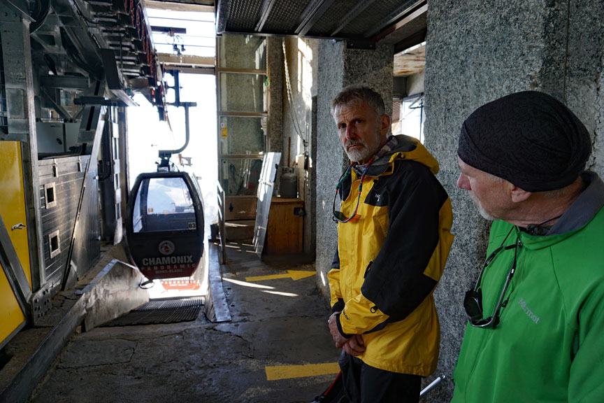 On day 3, Steve and Brook join Mark for a climb of the Aiguille d'Entrèves. Some skeptical looks as we prepare to board the Panoramique lift. |