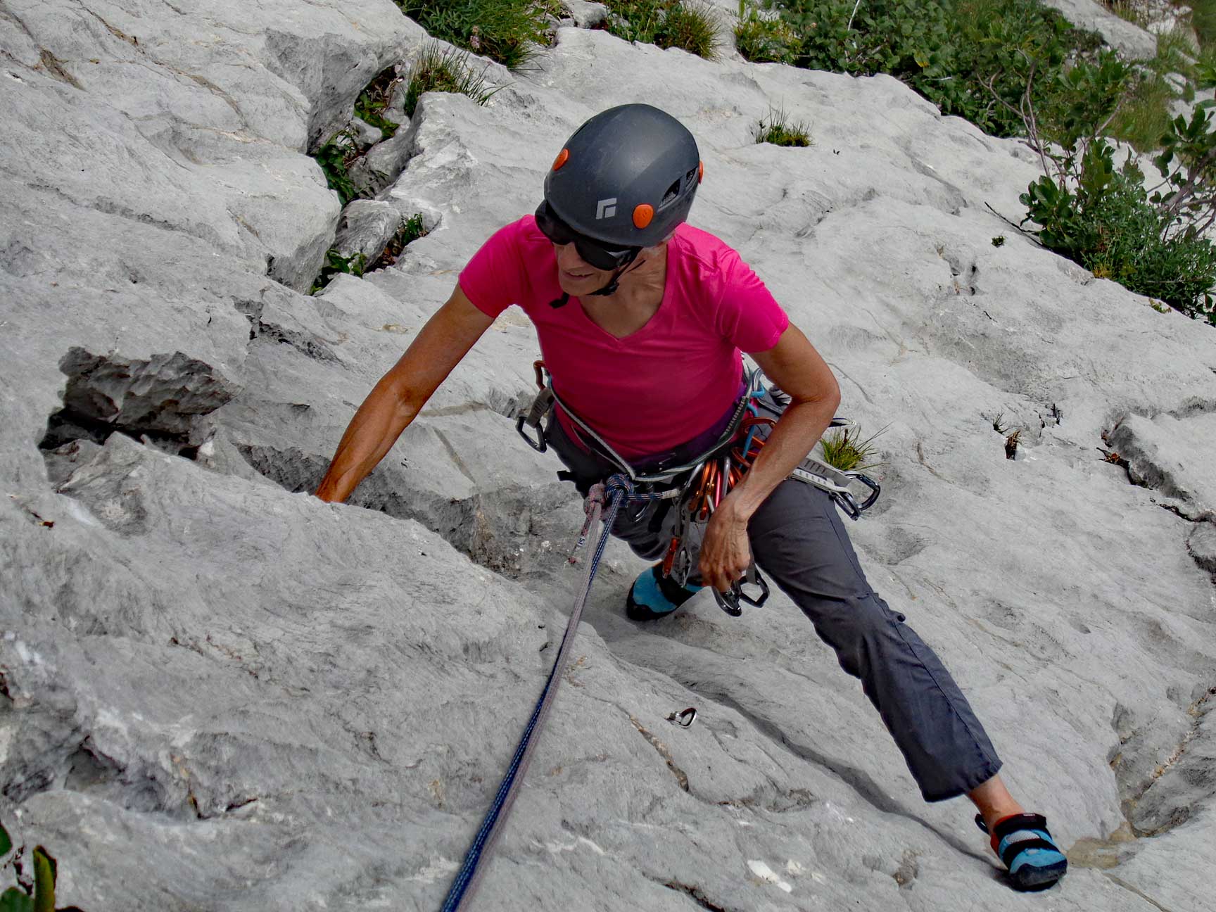 Gini, always happy to be on the rock. On our first day, we climbed a route called Hotel California, in the Aiguilles Rouges. For some inexplicable reason, I don't have nay photos from that day. |