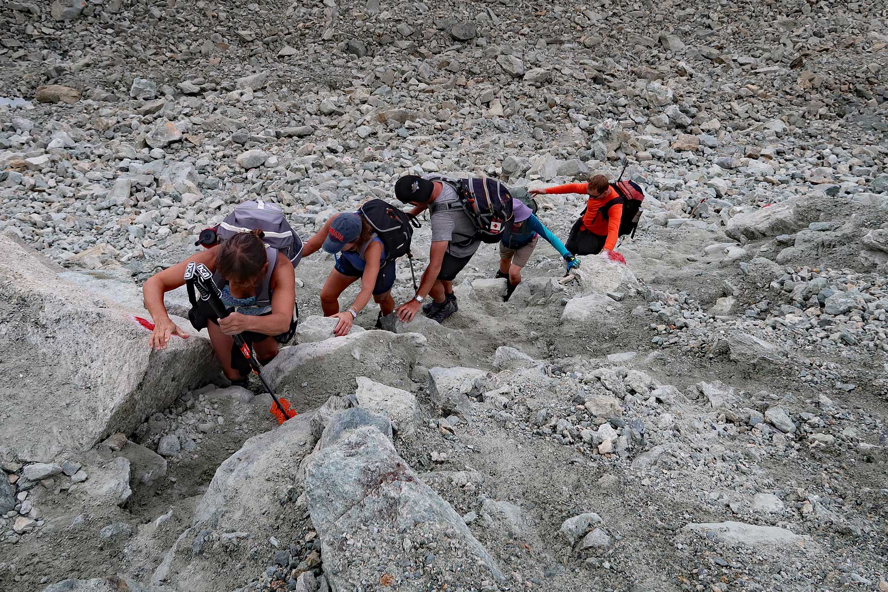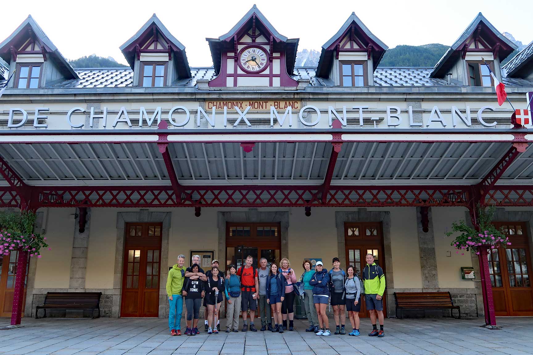And we're off! Mustering at the Chamonix train station on day 1, for a short transfer up valley to our trailhead in Montroc. |