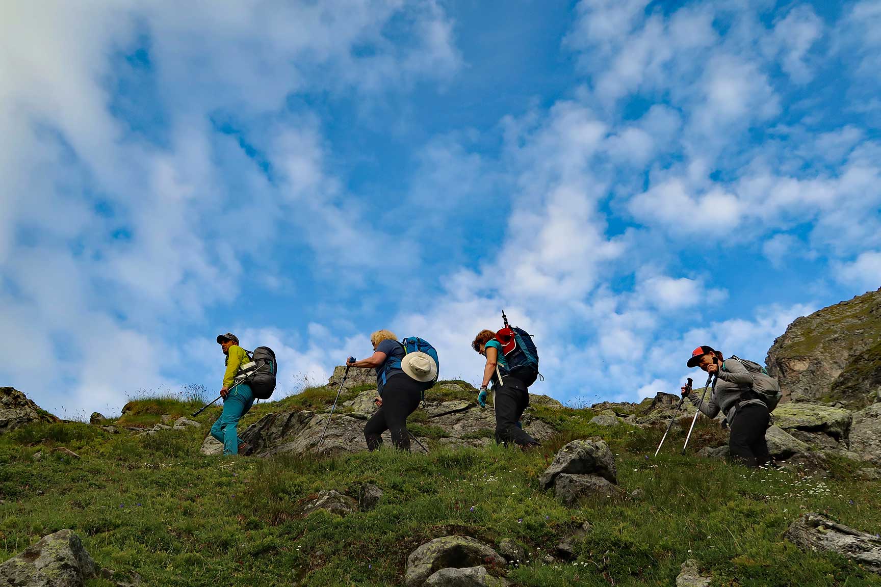 Passing through beautiful alpine meadows, the ripe wild blueberries continue to mess with our time plan. |