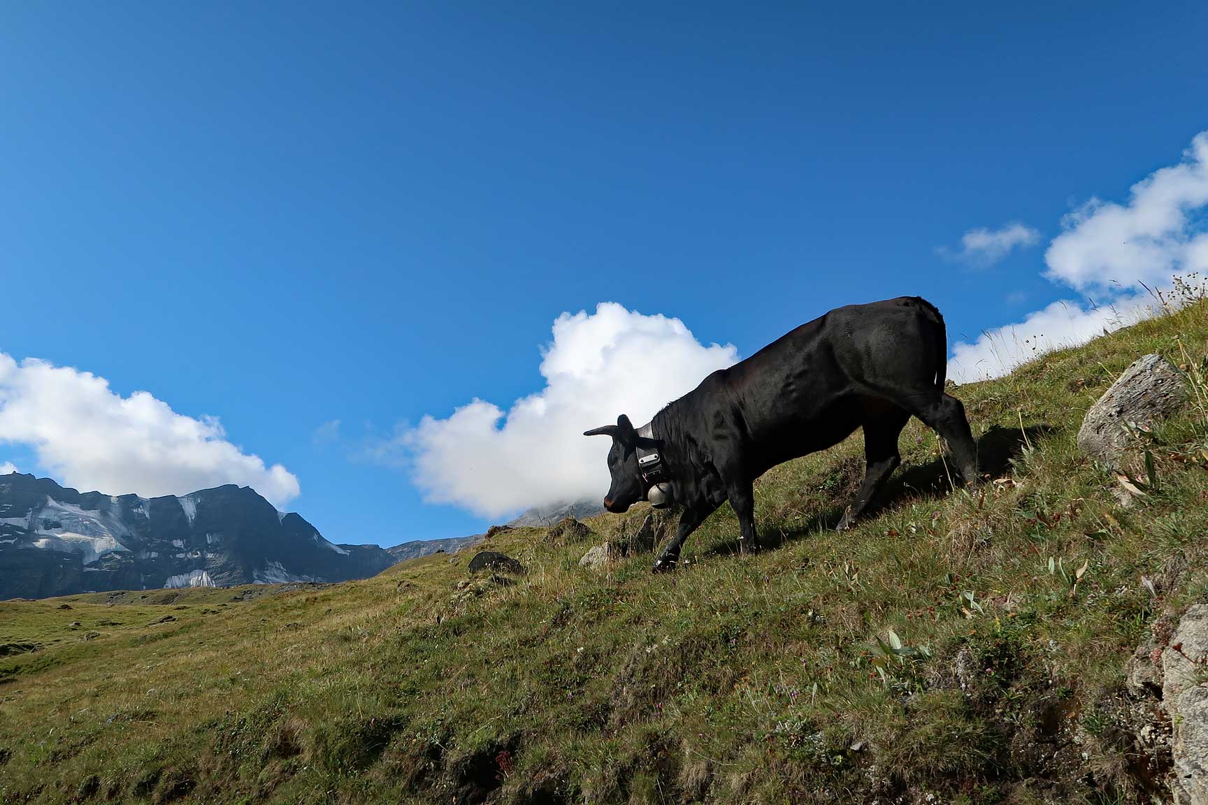 We are accompanied for a short way by this young "fighting cow". Bred for their competitiveness with each other, these beefy females of the Herens breed, love indulging in shoving competitions. Their owners take pride in breeding champion "queens of the combat". Between tournaments, they wander at will in the high pastures, and look pretty contented. |