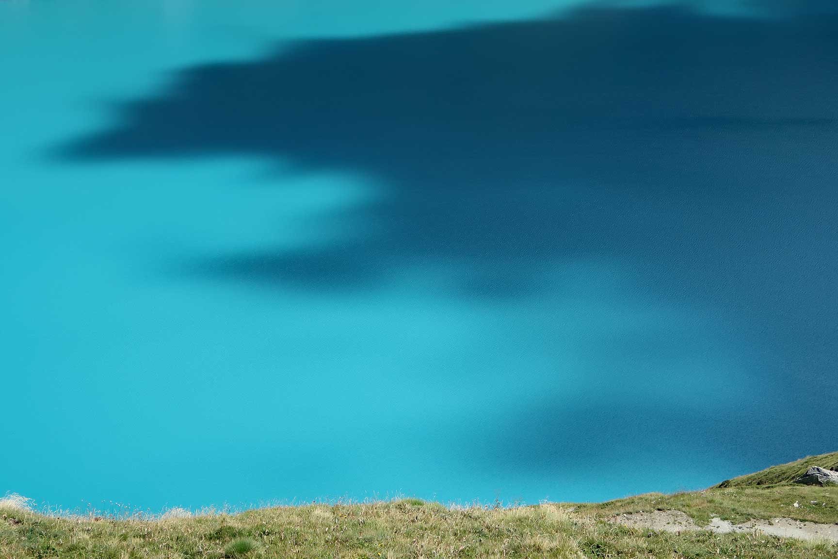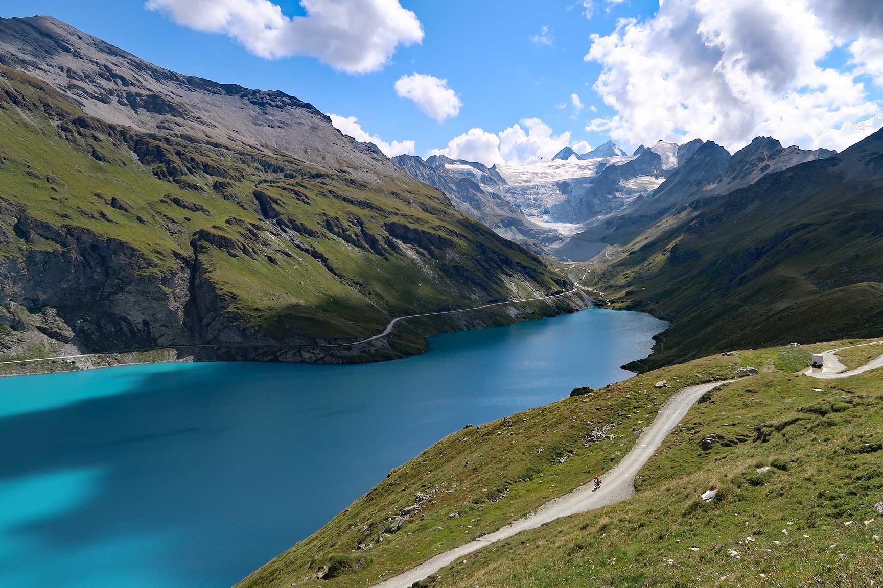 We descend toward the other-worldly blue of the Lac de Moiry, hte Moiry Glacier and the Grand Cornier in the far distance. |