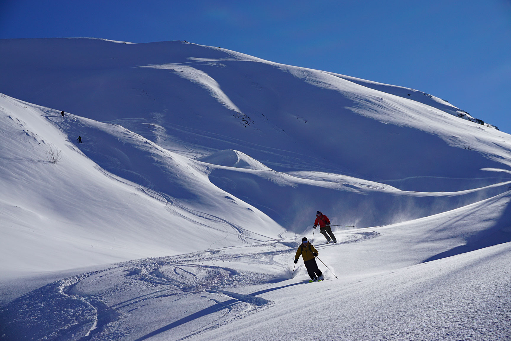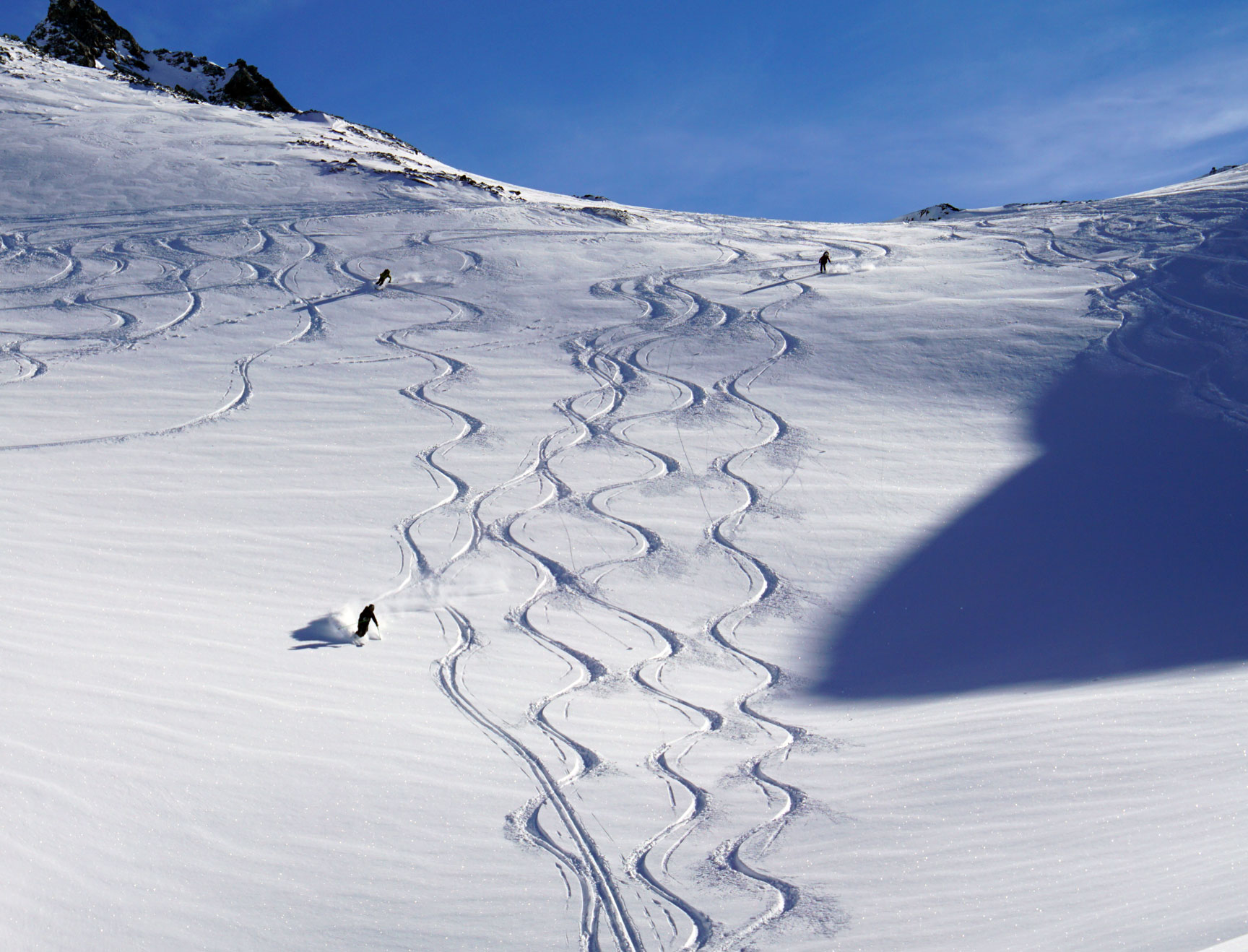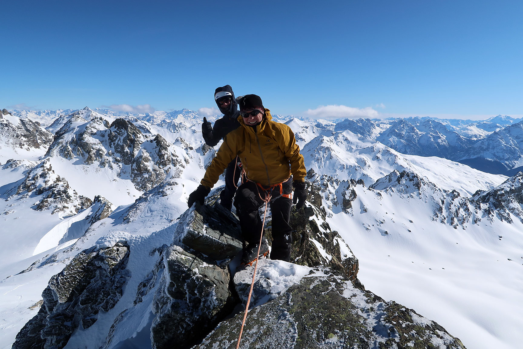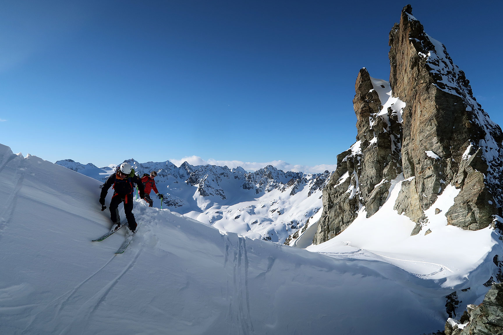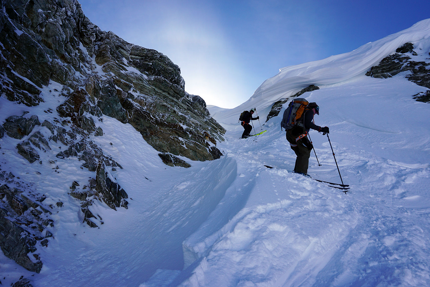 Just to mix things up a bit, we took another lap over a wind-scoured col. Tom and Bill maneuver through the near vertical cornice wall... |