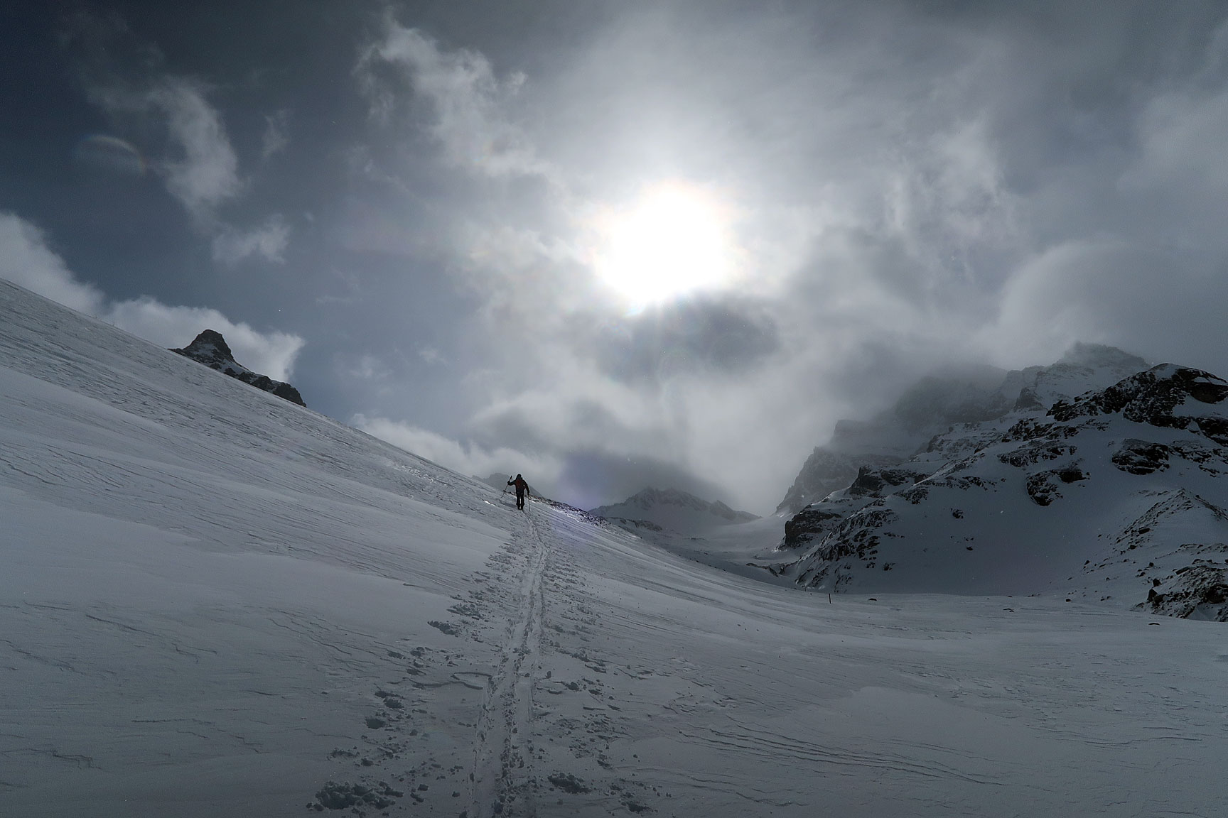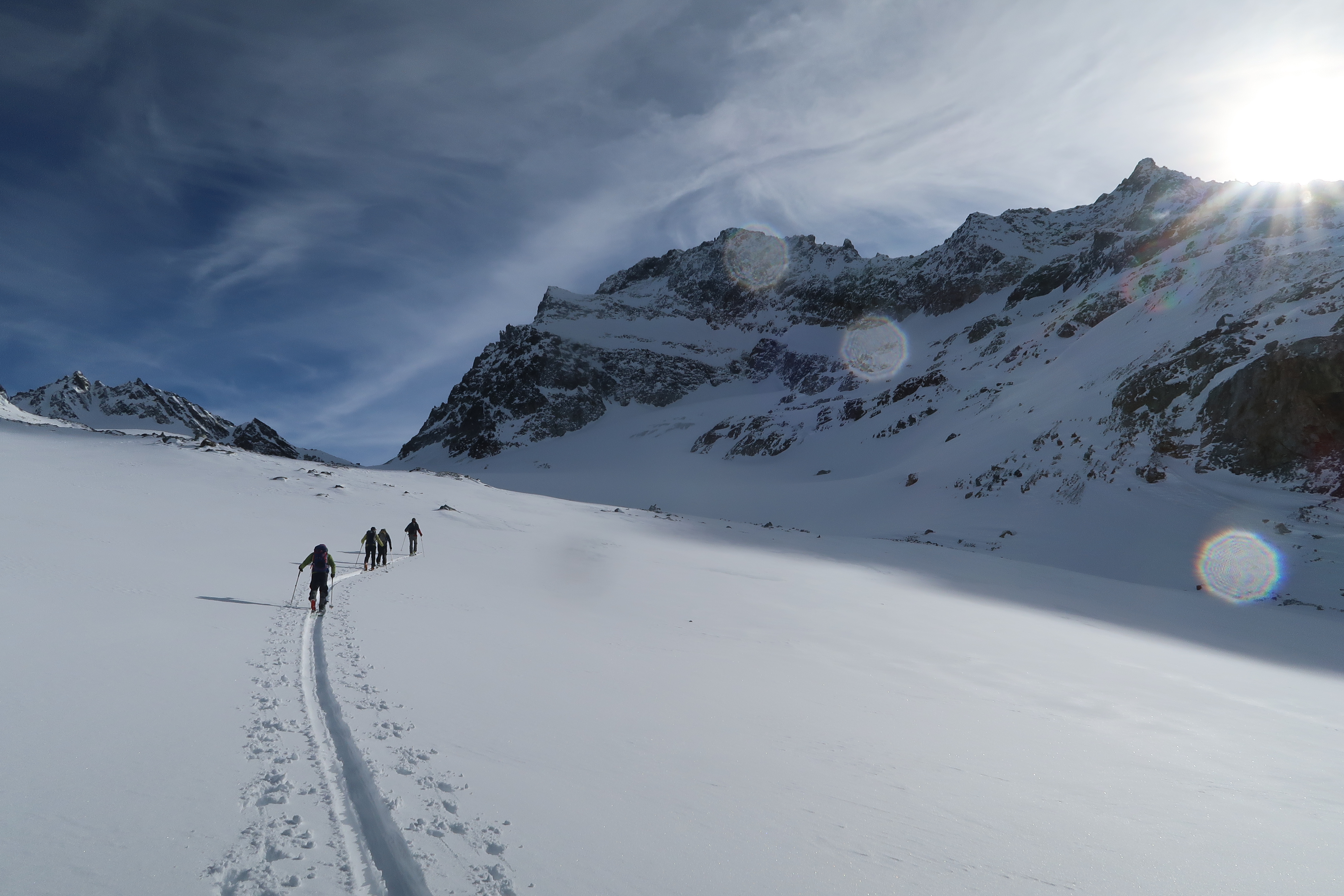 Day 5, we head over to the Wiesbadener hut. Variable snow, variabl weather, but comfortable enough transit day. |
