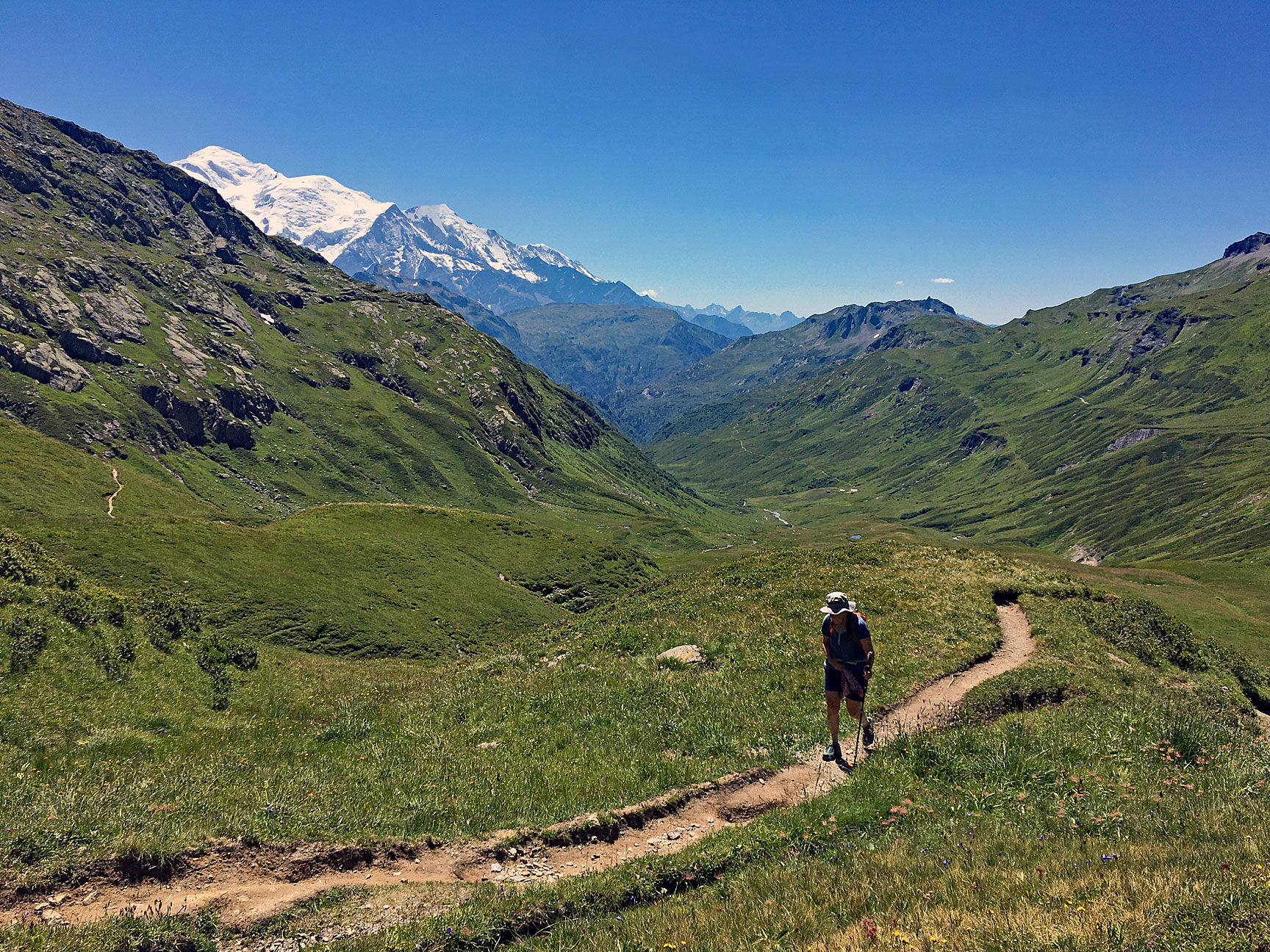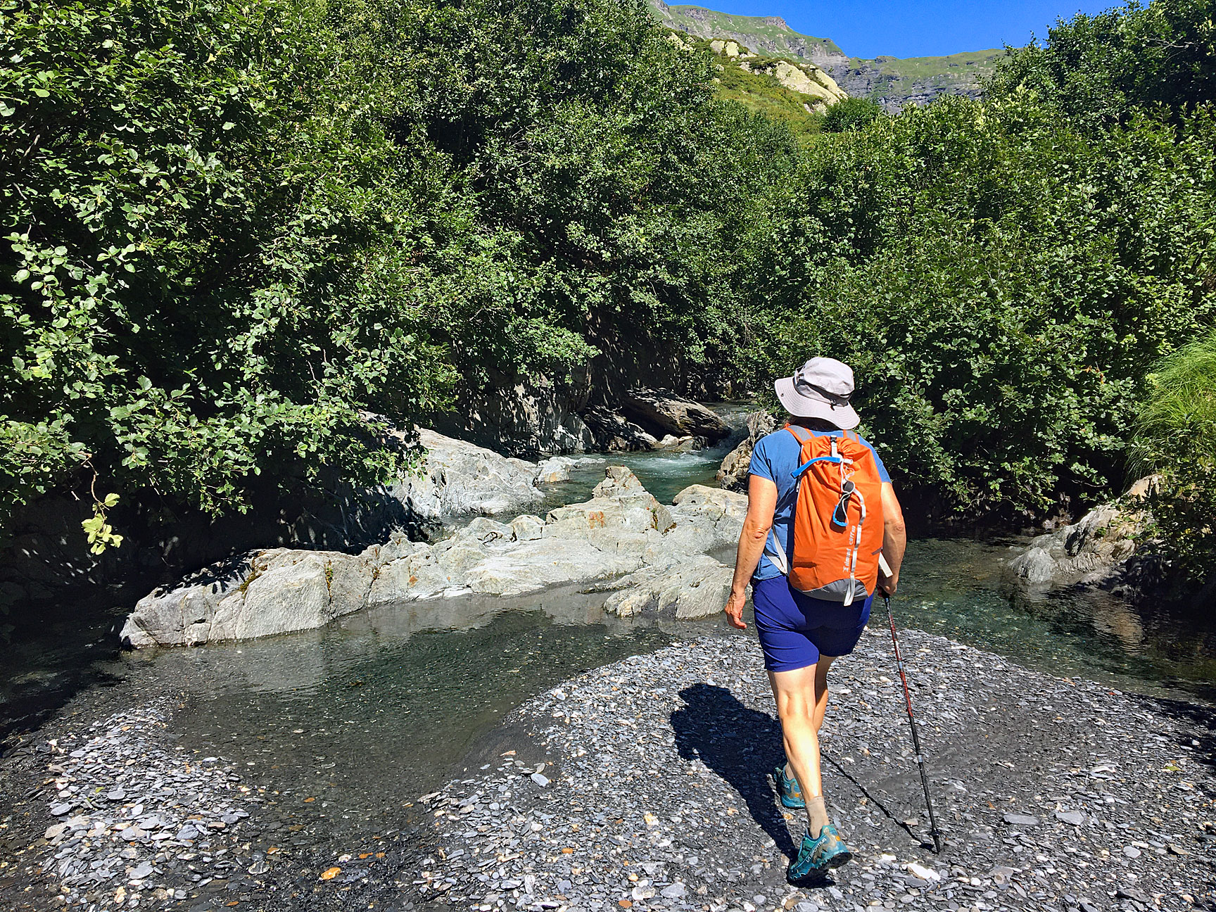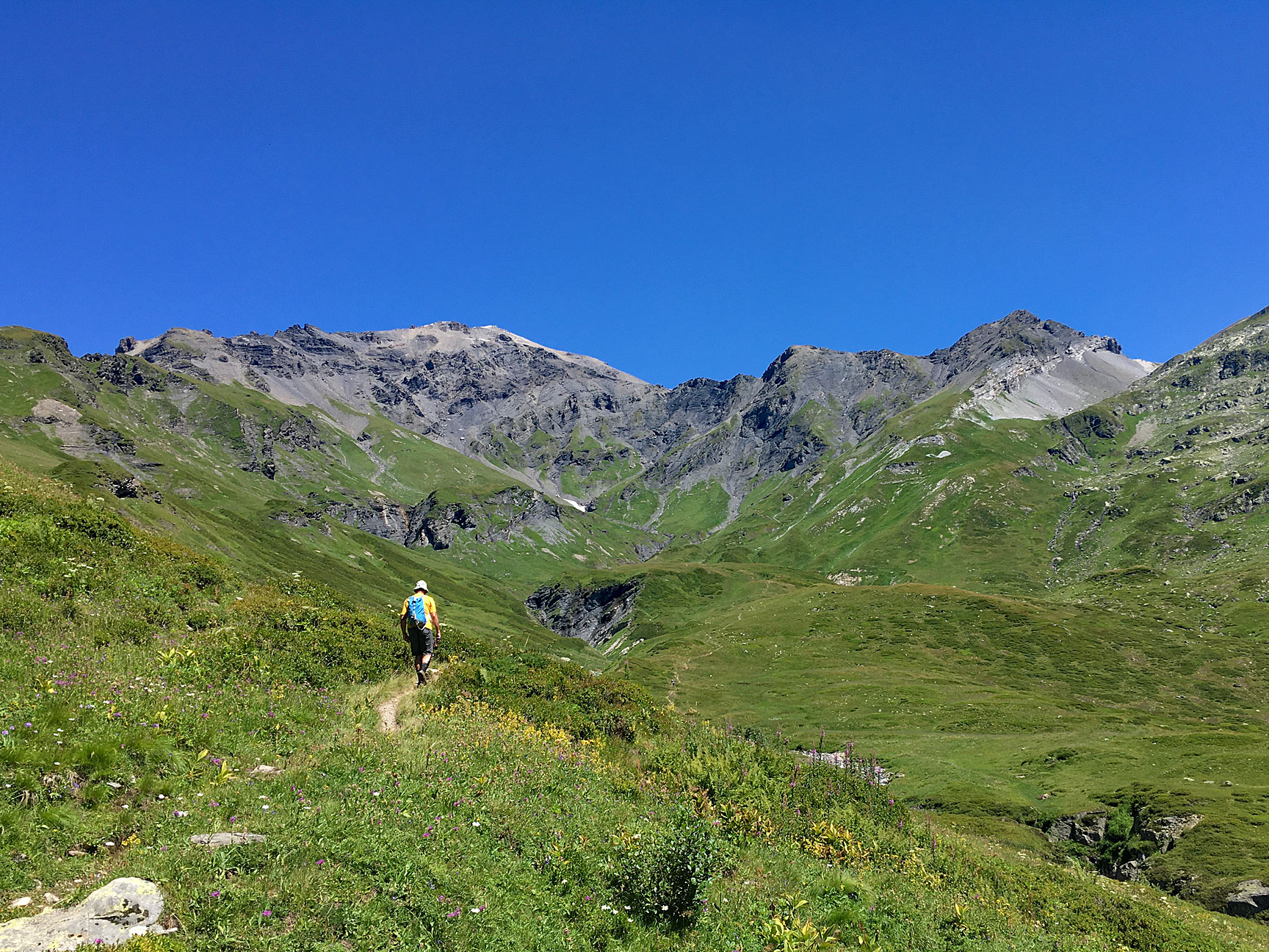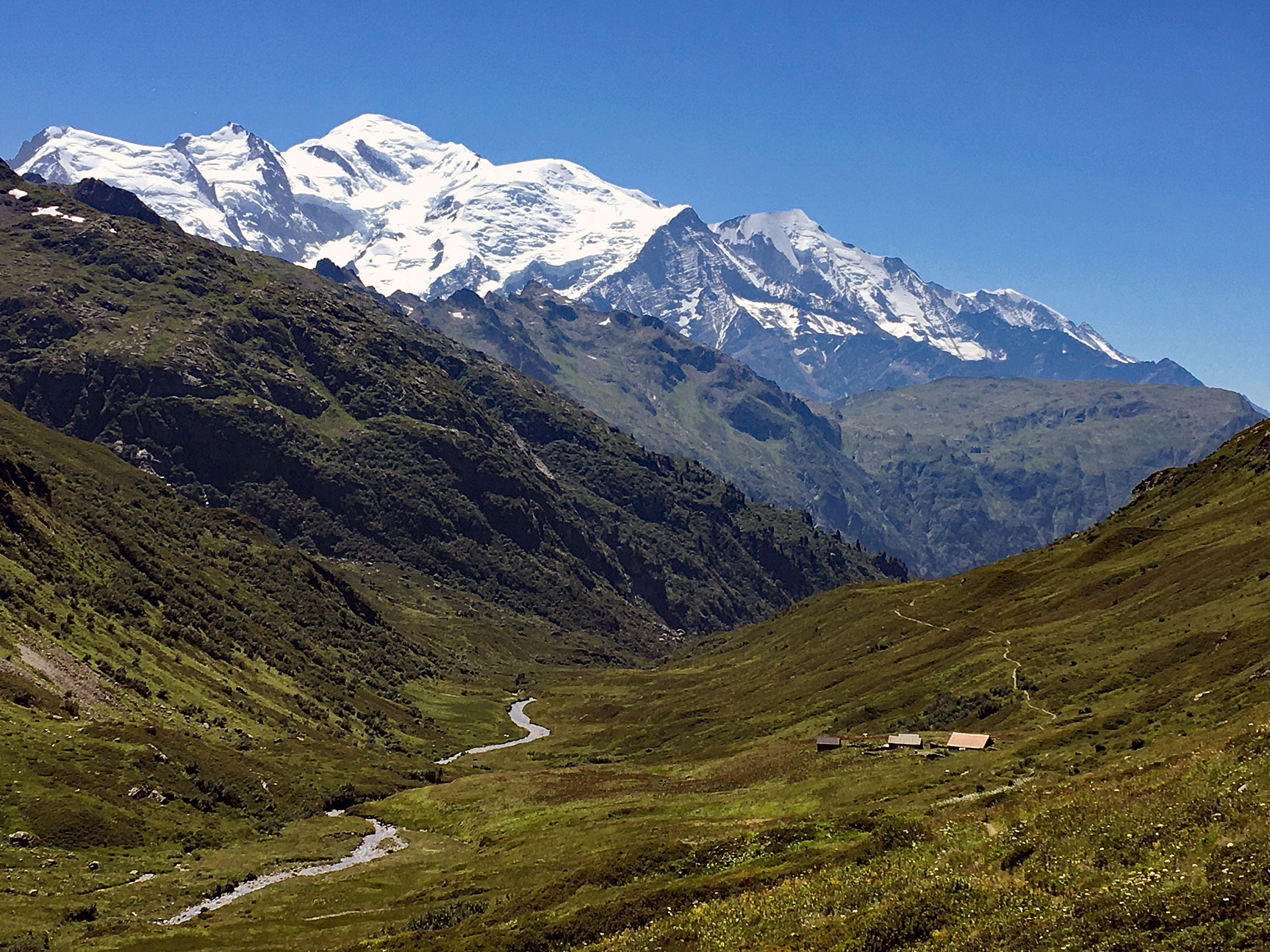 I (Kathy) always wanted to check out the long, wide open valley behind the Aiguilles Rouges, up against Le Buet. Near at hand, yet remote feeling, it seemed like a good way to try and escape the heat. Taking light packs, we aspired to go from Le Brévent tothe village and train stop at Le Buet in the day. It was a long one, but it worked!