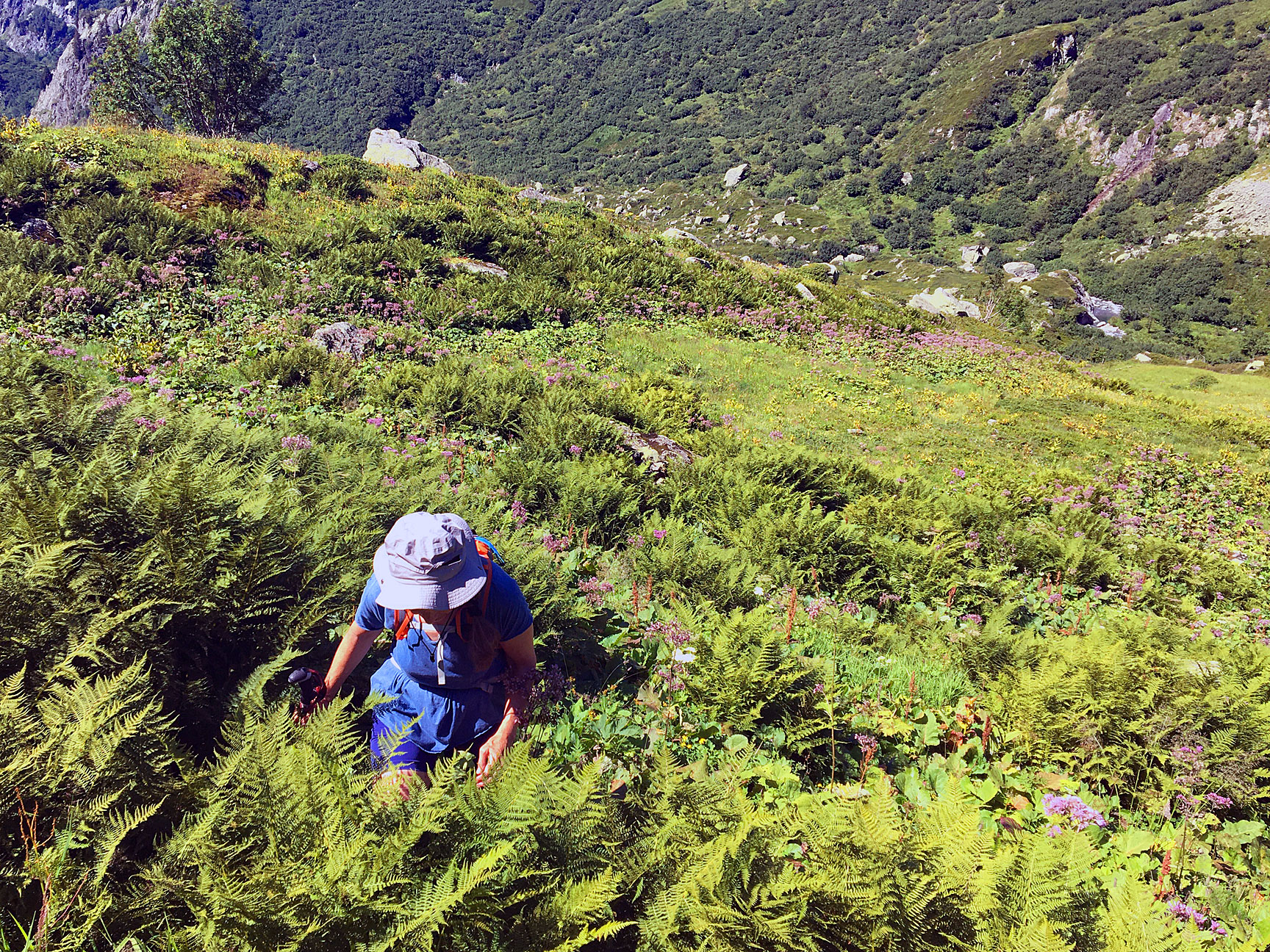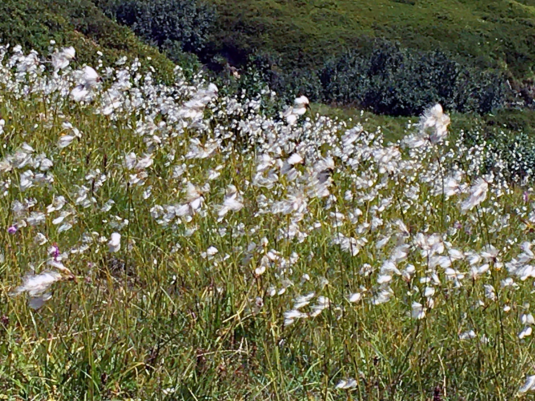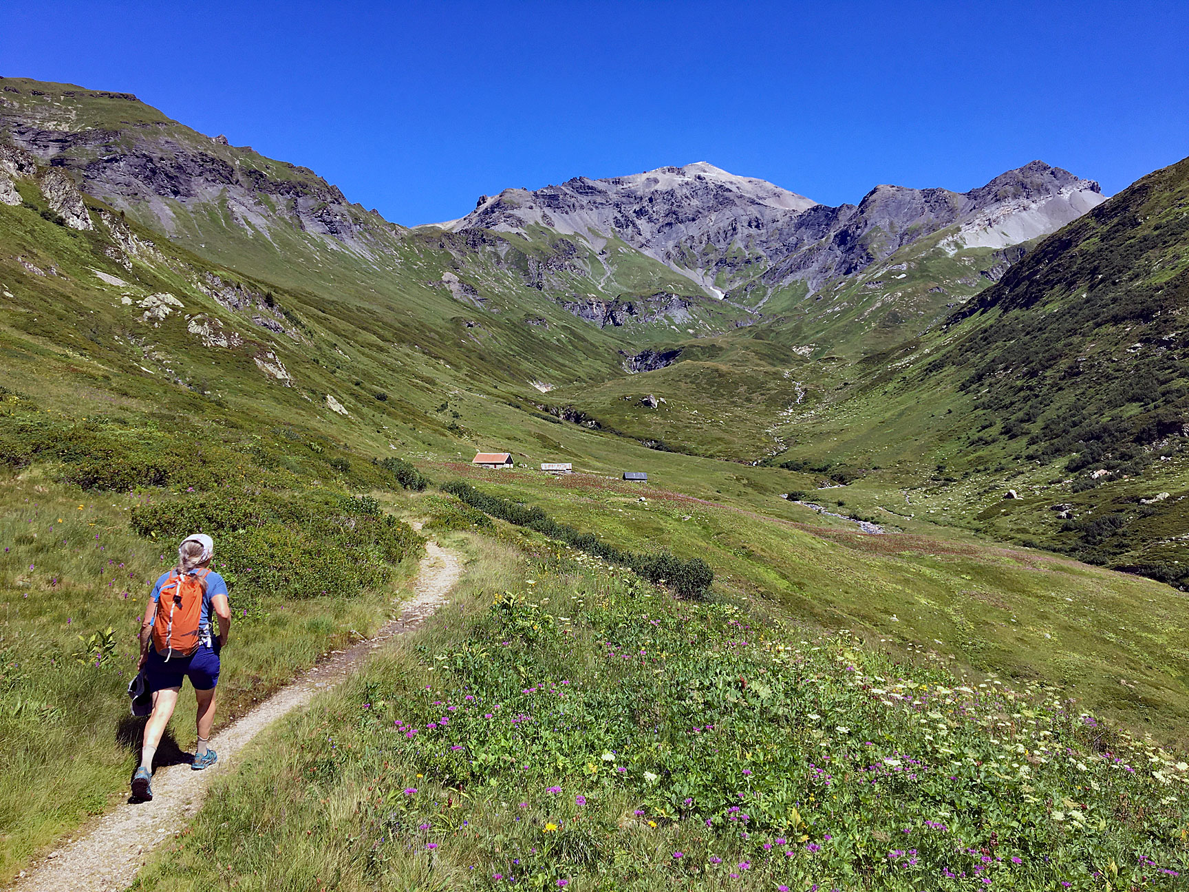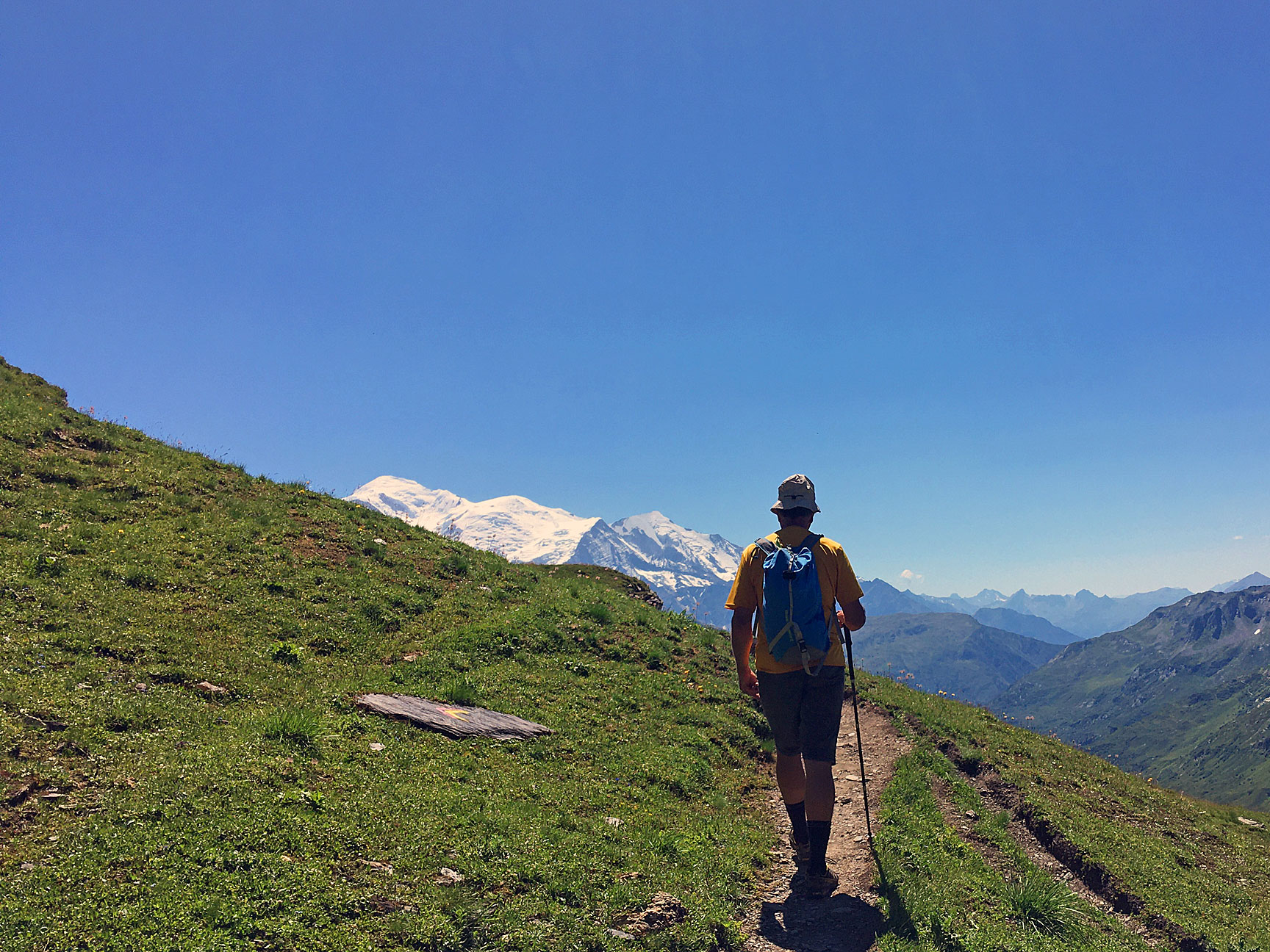 I (Kathy) always wanted to check out the long, wide open valley behind the Aiguilles Rouges, up against Le Buet. Near at hand, yet remote feeling, it seemed like a good way to try and escape the heat. Taking light packs, we aspired to go from Le Brévent tothe village and train stop at Le Buet in the day. It was a long one, but it worked!