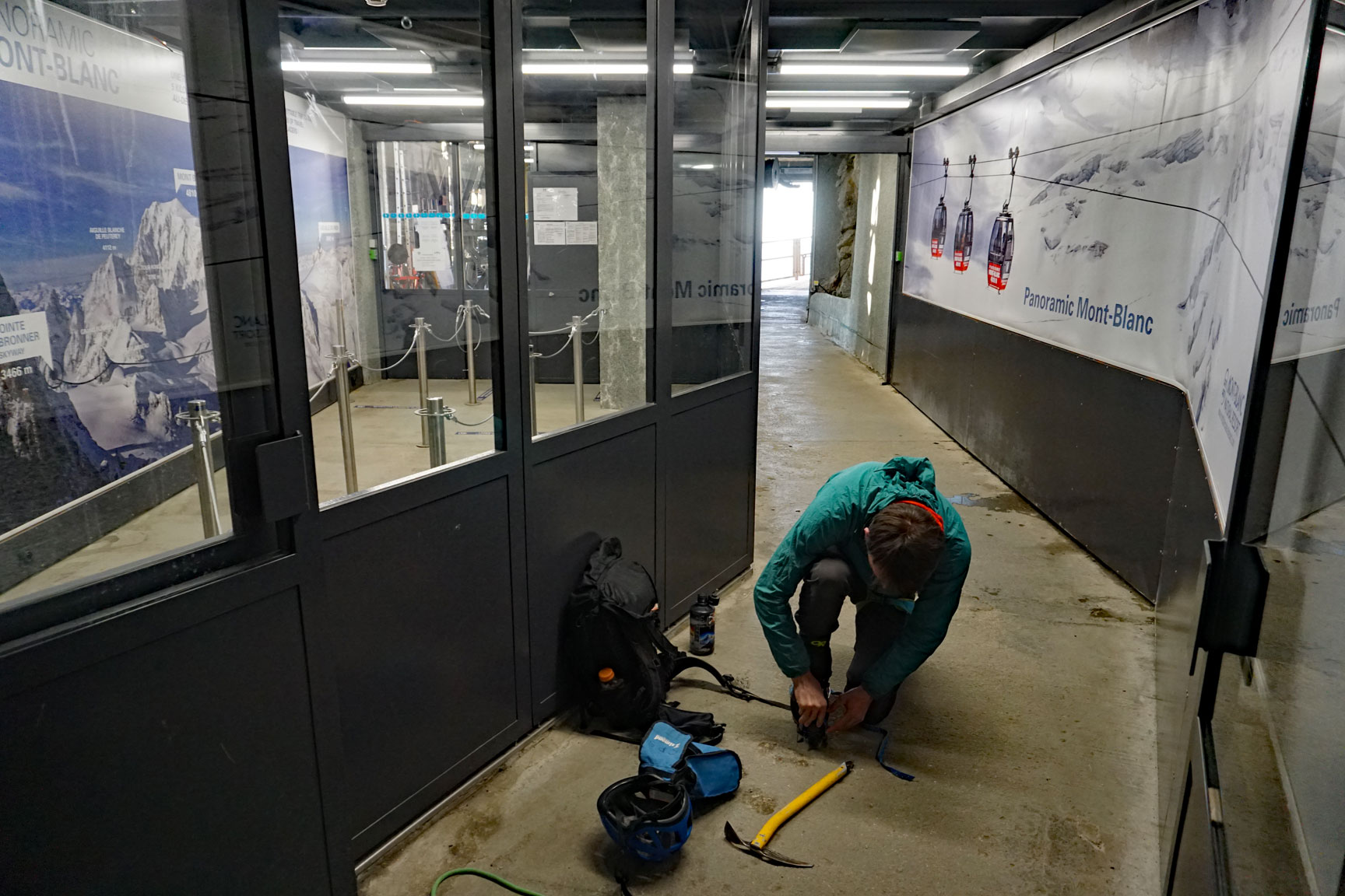 But wait! It's not over yet! After the hike, Richard teamed up with Mark to climb the classic traverse from the Aiguille du Midi, to the Aiguille du Plan (and back again). Preparing in the corridor of the Aiguille du Midi téléphérique top station. |