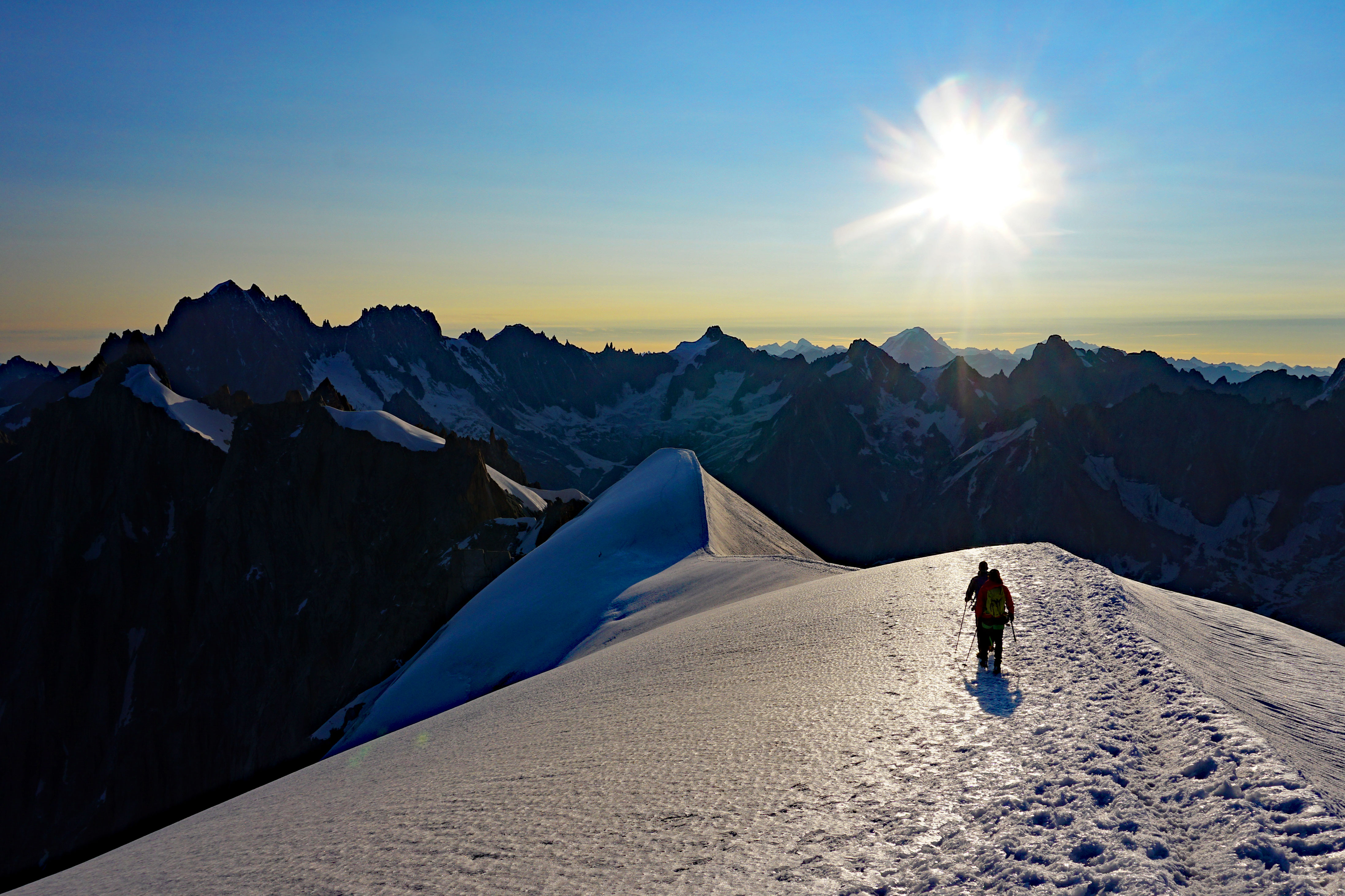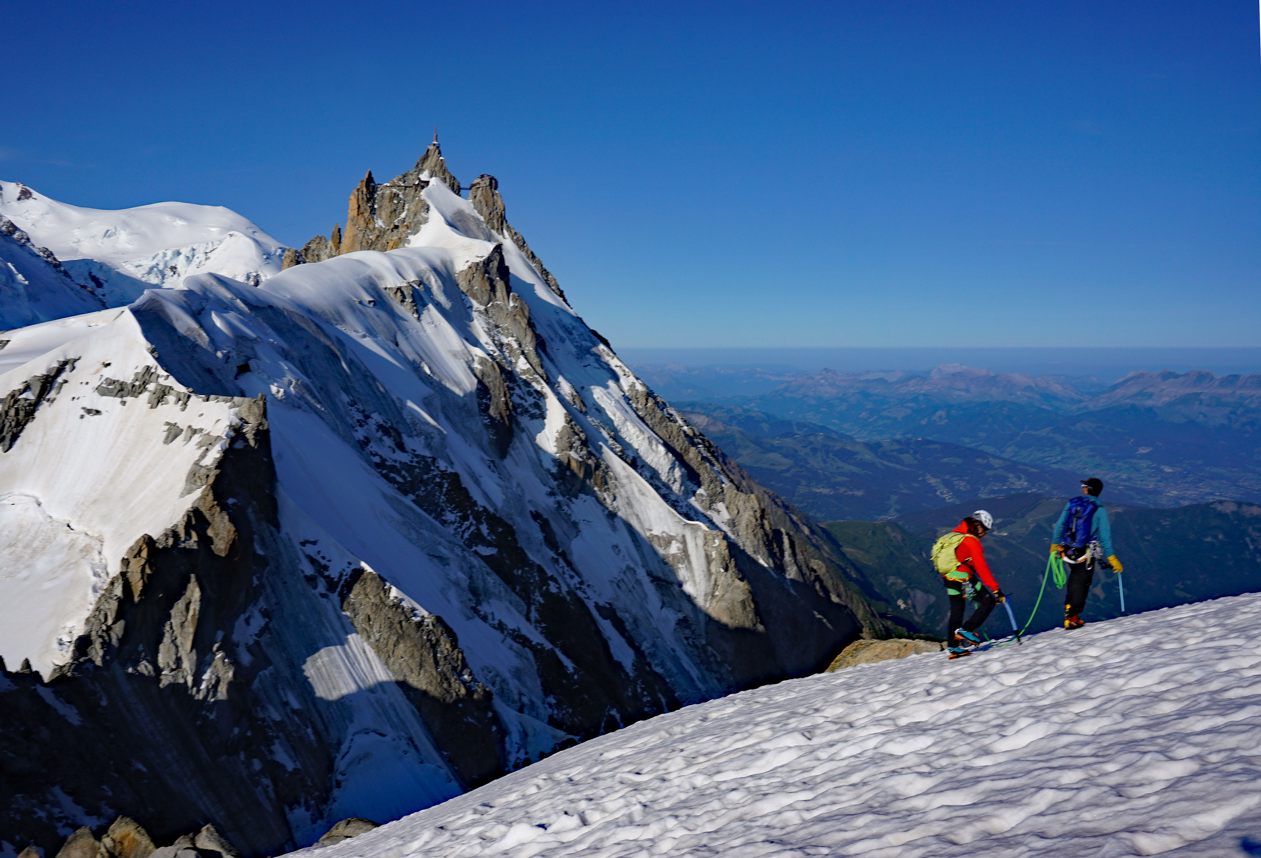 Heading out along the snowy ridge section from the Aiguille du Midi. If you look verrrry very carefully, below the sun flare there is a tiny blip peeking out from the right side of the Grand Combin, that is the mighty Matterhorn from a great distance |