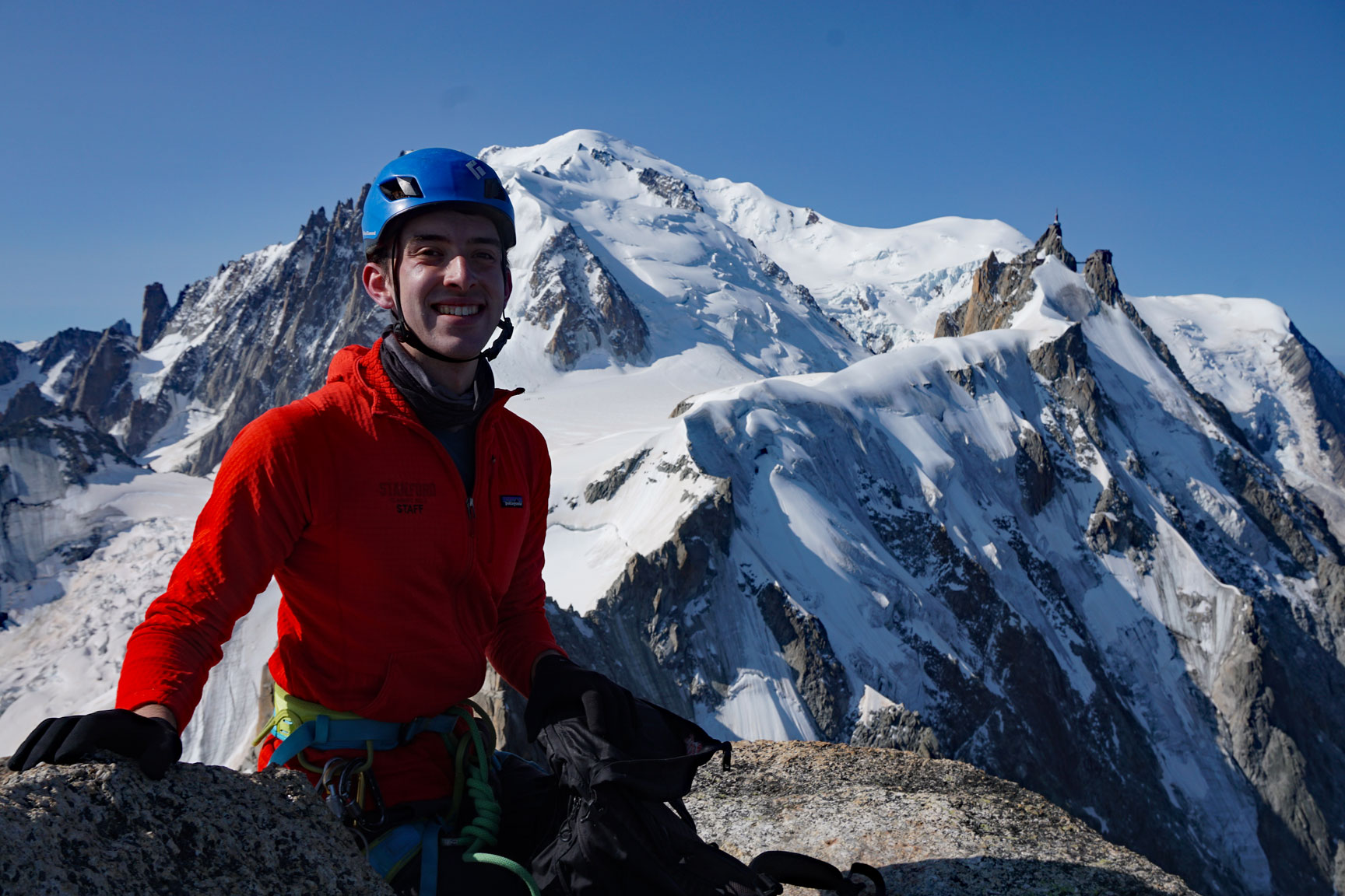 Nearing the summit of the Aiguille du Plan, Mont Blanc in the background left. |