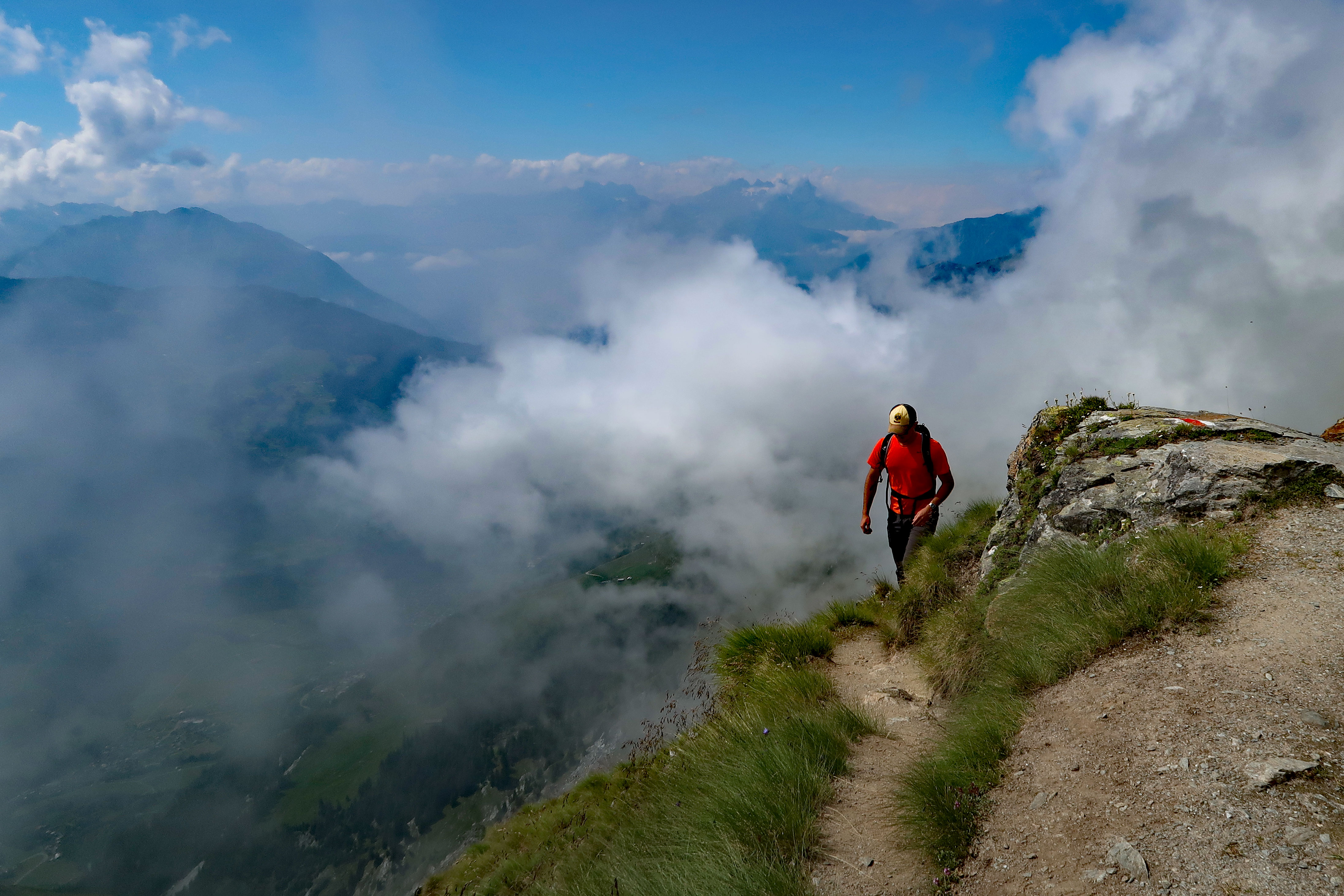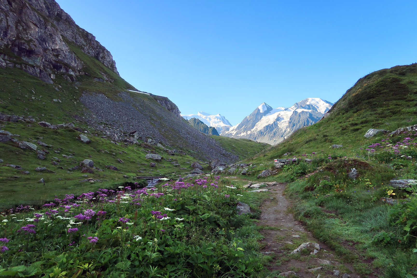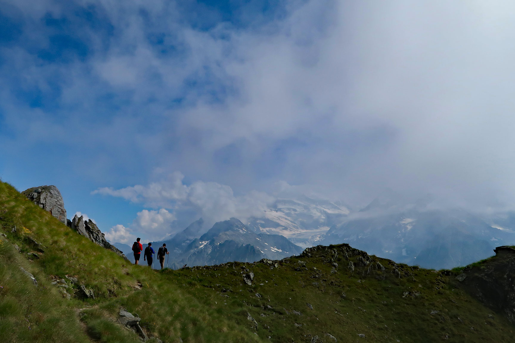 The clouds still make the views more interesting, we head down toward our resting place for the evening, the Grand Combin making a dramatic appearance in the distance. |