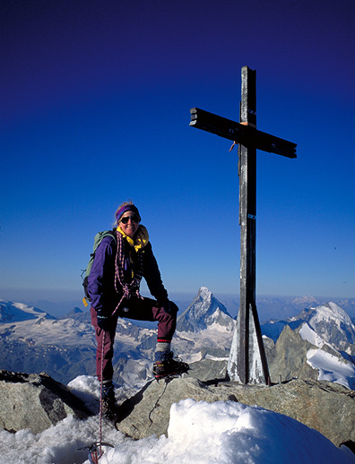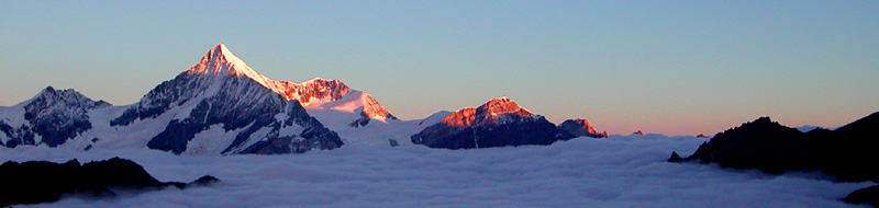 The Weisshorn deserves a fame and popularity equal to the Matterhorn, but we're just as glad if the shadow of its more famous neighbor keeps the crowds relatively small on this beautiful peak. Towering to 4506 meters, 14,780 feet, the Weisshorn is a massive 3 ridged pyramid, rising above the Zermatt valley downstream and to the north of the town. Its normal route via the East Ridge is physically and technically demanding, with long sections of 4th and easy 5th class, a tricky and exposed rock ridge requiring care and the occasional belay, and a summit snow or ice slope up to 45 degrees. The altitude is also a part of its challenge, and the vertical gain on summit day is significant at 1600 meters (5248 feet). Overall, the ascent is slightly harder than the Matterhorn, but, most climbers agree, of much higher quality. The route is best done allowing 2-3 days from Zermatt; the first for the 5000 foot approach hike to the Weisshorn Hut from the town of Randa; the second to ascend the peak and return to the hut or the road, and the third in case staying at the hut seems more appealing than descending yet another vertical mile after this strenuous and long day of climbing. |