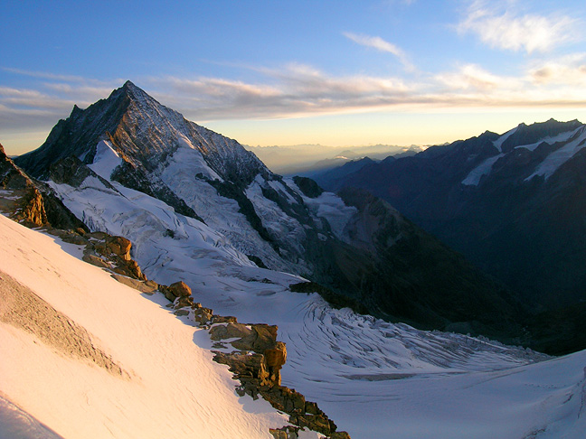 Difficulty We have decided to give this route our "4-mountain" rating, even though in many guidebooks it receives only a AD (fairly difficult) rating. Overall, it seems like a longer and more demanding outing than, say, the Hörnli route on the Matterhorn. The rock climbing is only about mid-5th class (except for one or two hard moves on the Lochmatter tower) but the route is very long, typically taking about 7 hours in ascent, and 4 to 5 down, and the climbing includes significatn challenges on both rock and snow. Prerequisites This is a big mountain route suitable for very fit cliimbers who can move very well over moderate, exposwed terrain, on both rock and snow. There are several very airy snow ridge crests, so proven ability on this kind of terrain is necessary. Combinations The Weisshorn hut is situated essential for this route only so there are few good combination climbs from it. However, for the very ambitious the Schaligrat (south ridge) of the Weisshorn is one of the best climbs in the Valais alps, and normally includes a descdnt of the East Ridge, described here. The Schaligrat is a 3 to 4-day outing; day 1 to the Rothorn hut, day 2 up and over the Schalihorn and down to the Schalijoch bivouac hut, day 3 up the Schaligrat on the Weisshorn and down to the Weisshorn hut (and possibly down to the valley), and day 4 to get to the valley if it did not happen on day 3. |